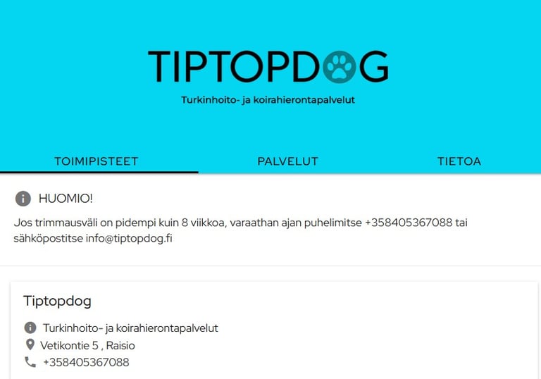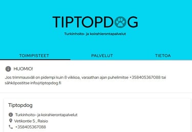 Ole ajoissa paikalla! Tulen pihalle vastaan kun olen valmis ottamaan koiran hoidettavaksi. Yli 10 min myöhästyminen voi aiheuttaa sen että emme pysty suorittamaan koko palvelua.